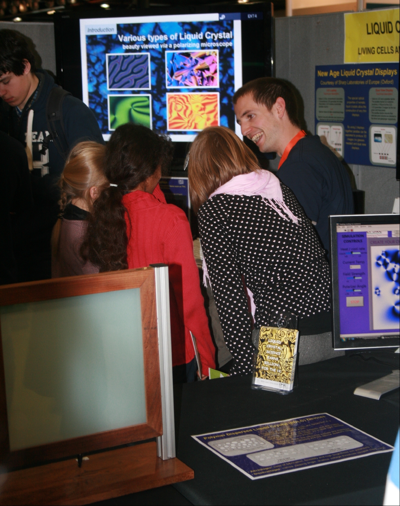 "Liquid Crystals: living cells and flat screen TVs" is our overview presentation on the topic of liquid crystals. It is aimed at the general public, from school kids to adults, to demonstrate the latest developments in the liquid crystal research and to engage the visitors in discussions about the related technologies. Selected and informative hands-on experiments explain the basics aspects of liquid crystal properties, such as birefringence, phase transitions, thermochromism, as well as the principle of flat screen TVs operation. The magic of selectively reflecting beetles and the strength of Kevlar fibres and fabric, which is used in a bullet-proof jacket, has proved particularly popular. |